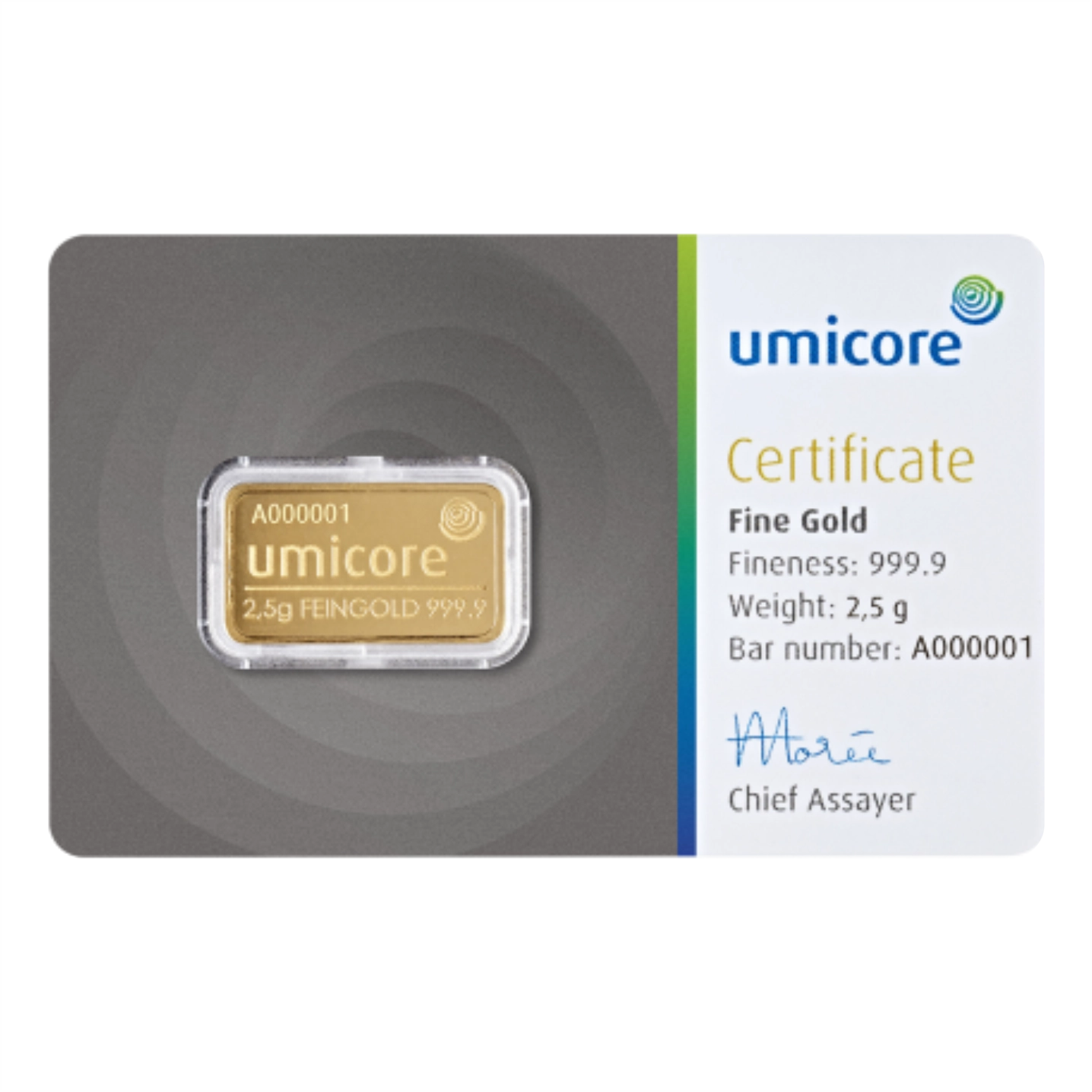 Umicore goudbaren en goudplaatjes zijn verpakt in een certificaat van echtheid en hebben een Good Delivery Status en zijn hierdoor overal ter wereld verhandelbaar.